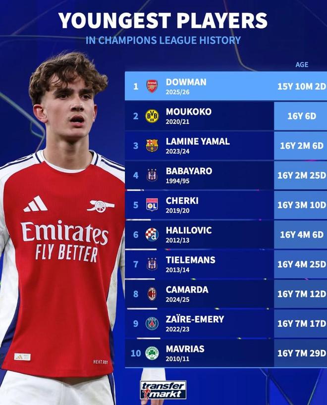 1. 道曼(阿森纳) 15岁10个月2天(25-26赛季)